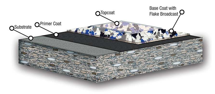 The Decorative Flake System is a decorative and extremely durable concrete resurfacing system. It is used for environments requiring an attractive, aesthetically pleasing, and high-performance floor. Our Columbus epoxy flooring contractors install our high performance floors in commercial areas, auto repair shops, animal care centers, manufacturing plants and more.